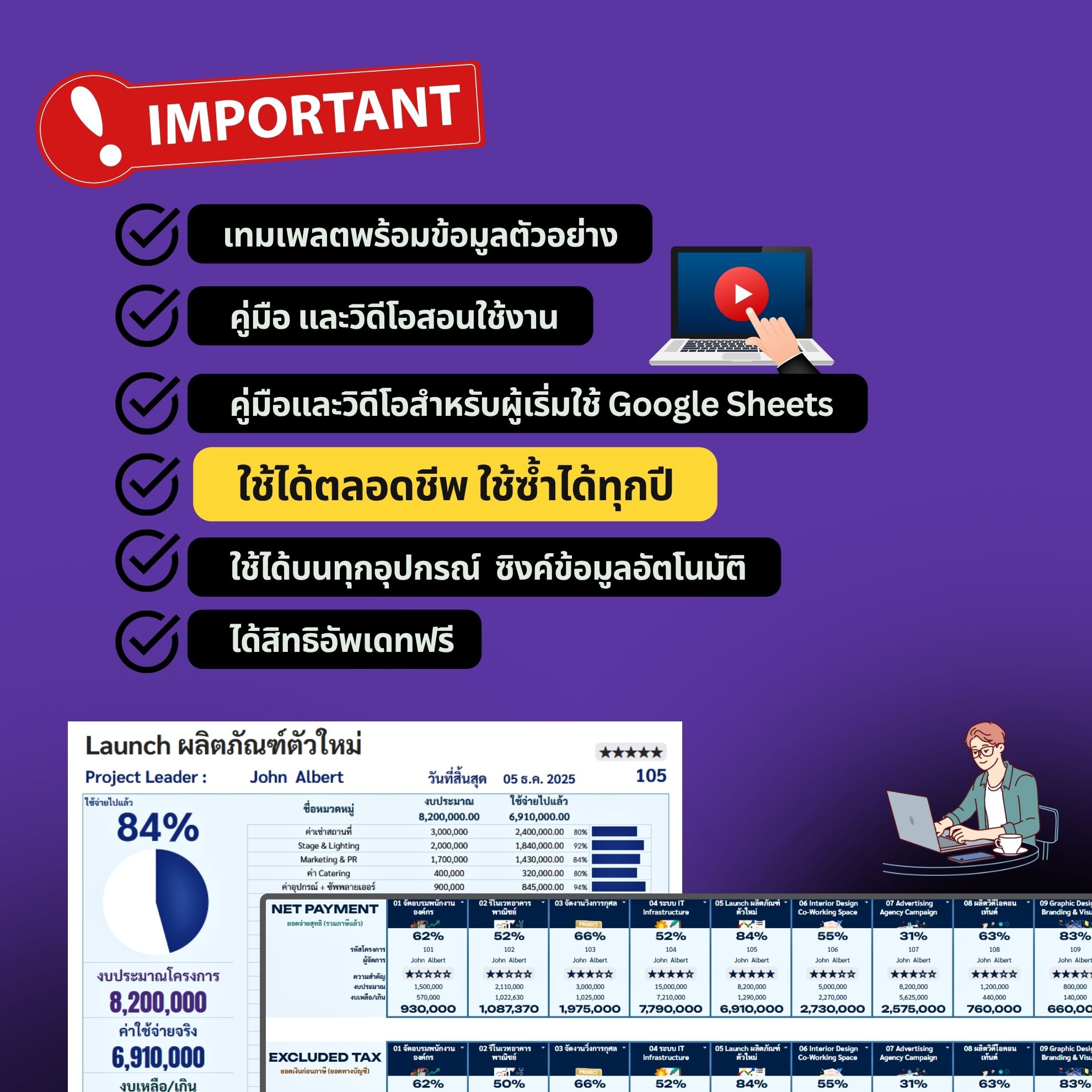ได้ลิงก์สำเนา Google Sheets พร้อมใช้งานทันที + คู่มือการใช้งาน + ใช้ได้ตลอดชีพ