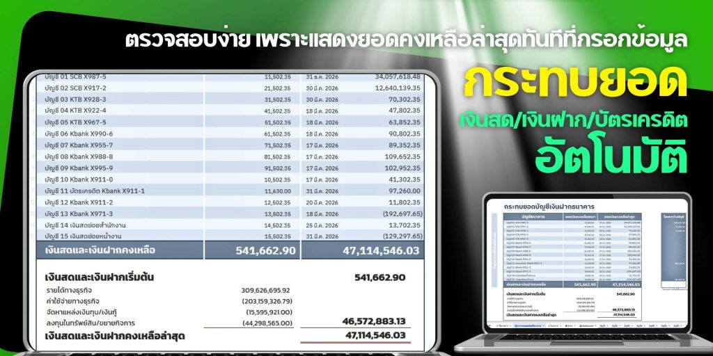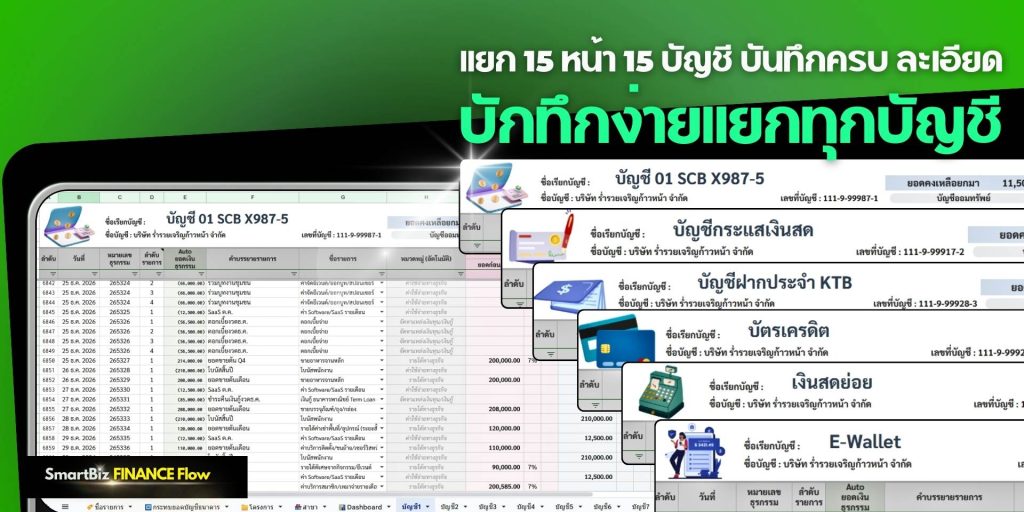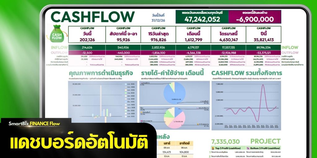 📊 แดชบอร์ดอัตโนมัติ | 💧 รู้ทันทีเงินเข้าจากไหน ไหลออกไปไหน | 🧾 แยกบันทึก 15 บัญชีธนาคาร | ✅ กระทบยอดได้ | 🧮 VAT/WHT | 🗂️ 100 โครงการ/ 100 สาขา สรุปยอดอัตโนมัติ