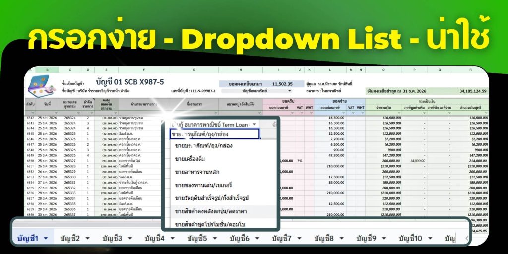 • บัญชี1–บัญชี15: ลงตาม statement ได้ทันที (รับ/จ่าย/โอน/VAT/WHT/โครงการ/สาขา/คงเหลือ)