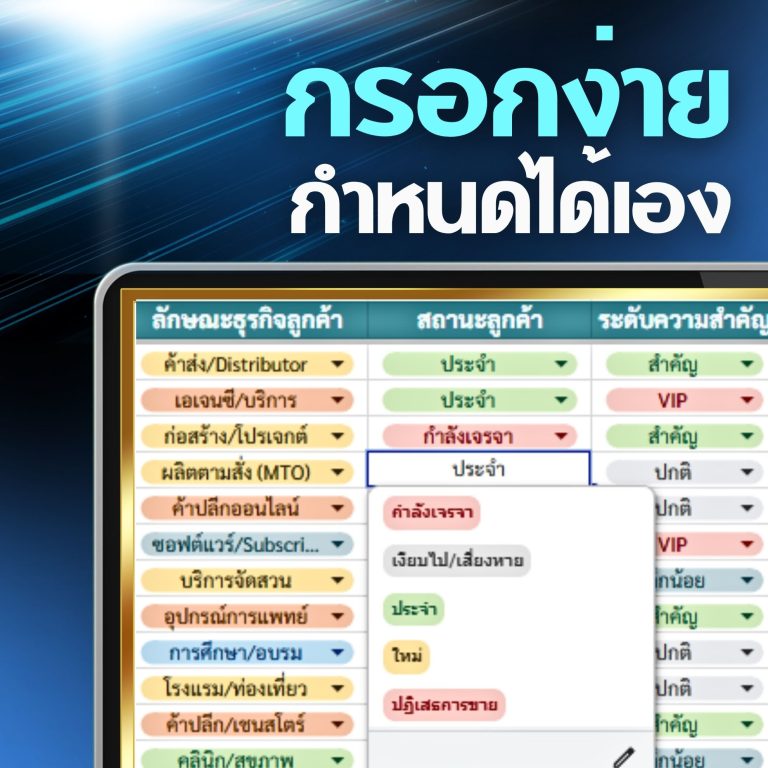 กำหนด สถานะงาน ตาม flow ธุรกิจ (พูดคุย/เสนอราคา/รอตอบ/ปิดดีล/ยกเลิก)